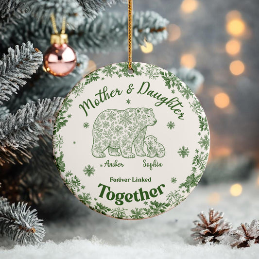Custom Bear Toile de Jouy Ceramic Ornament – Personalized Circle Ceramic Gift for Mom & Daughter/Son, Forever Linked Together