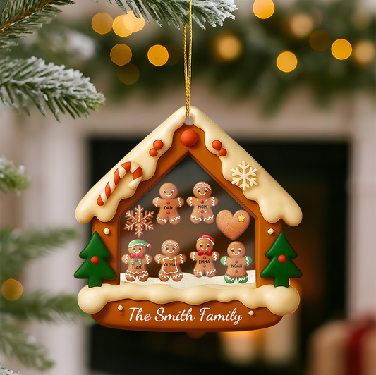 Custom Family Gingerbread House Ornament with Trees – Personalized Christmas Keepsake Acrylic Shaker Ornament