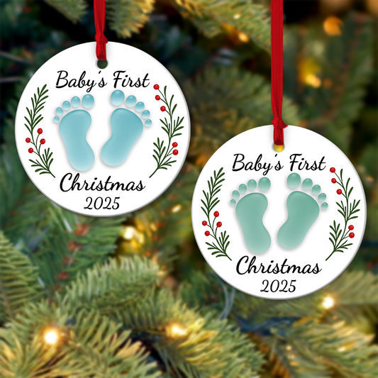 Custom Baby’s First Christmas Ceramic Ornament 2025 – Personalized Footprint Design, Pink & Blue Options, Newborn Keepsake Gift