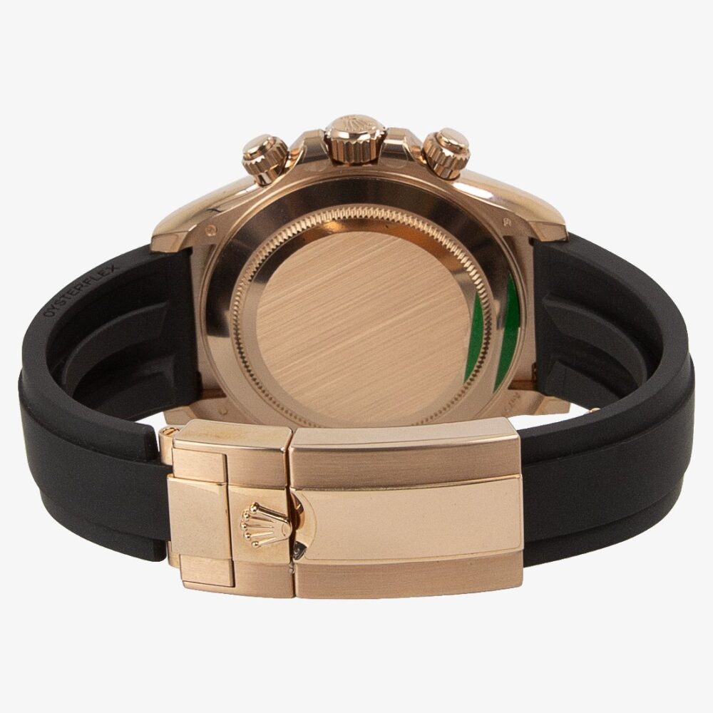 40mm 18kt Everose Gold Case, Fixed Black Ceramic Bezel With Engraved Tachymetric Scale, Chocolate Dial With Black Sub-Dials, Automatic Movement With Chronograph Function, On a Black OysterFlex Rubber Strap.