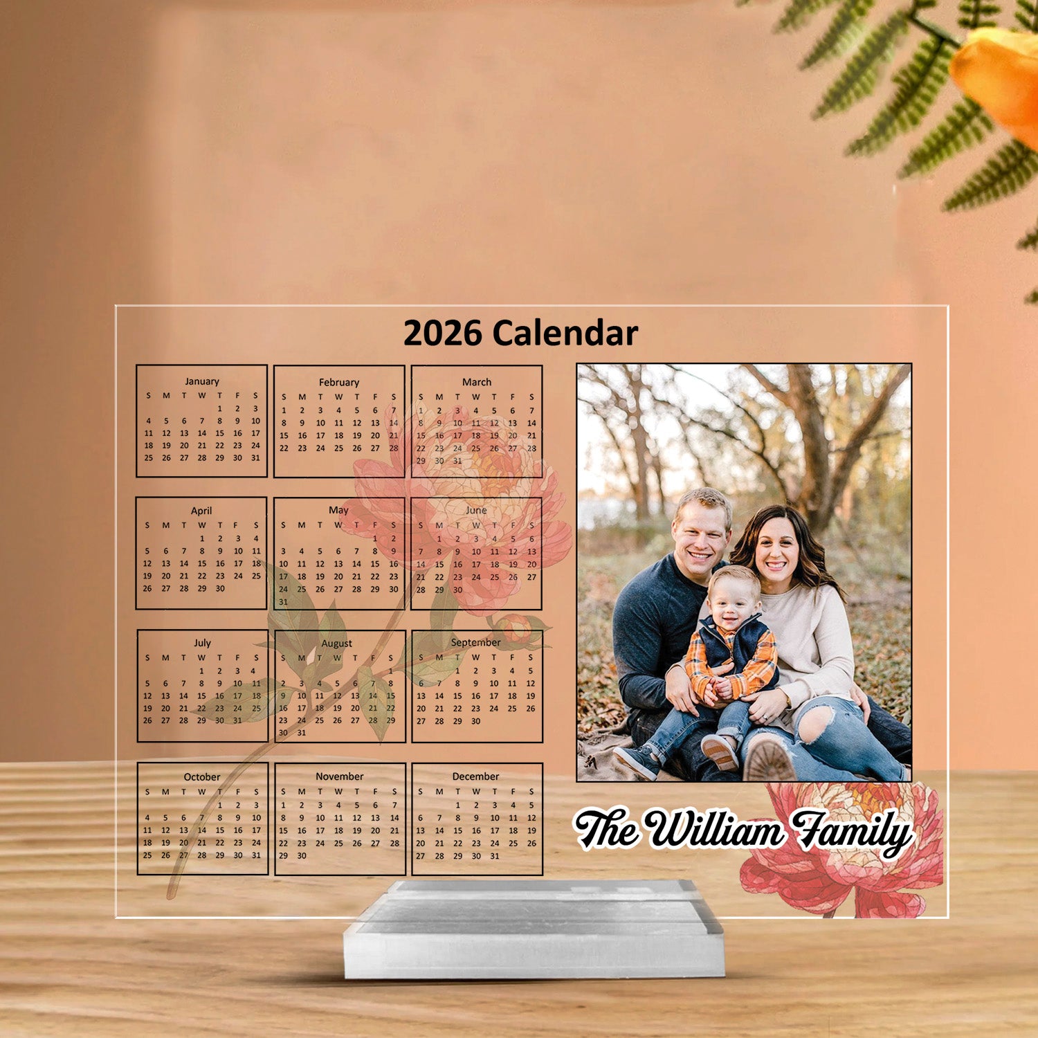 Custom Acrylic Photo Calendar Plaque 2026 – Personalized Family Name Desk Display with Monthly Flower Design