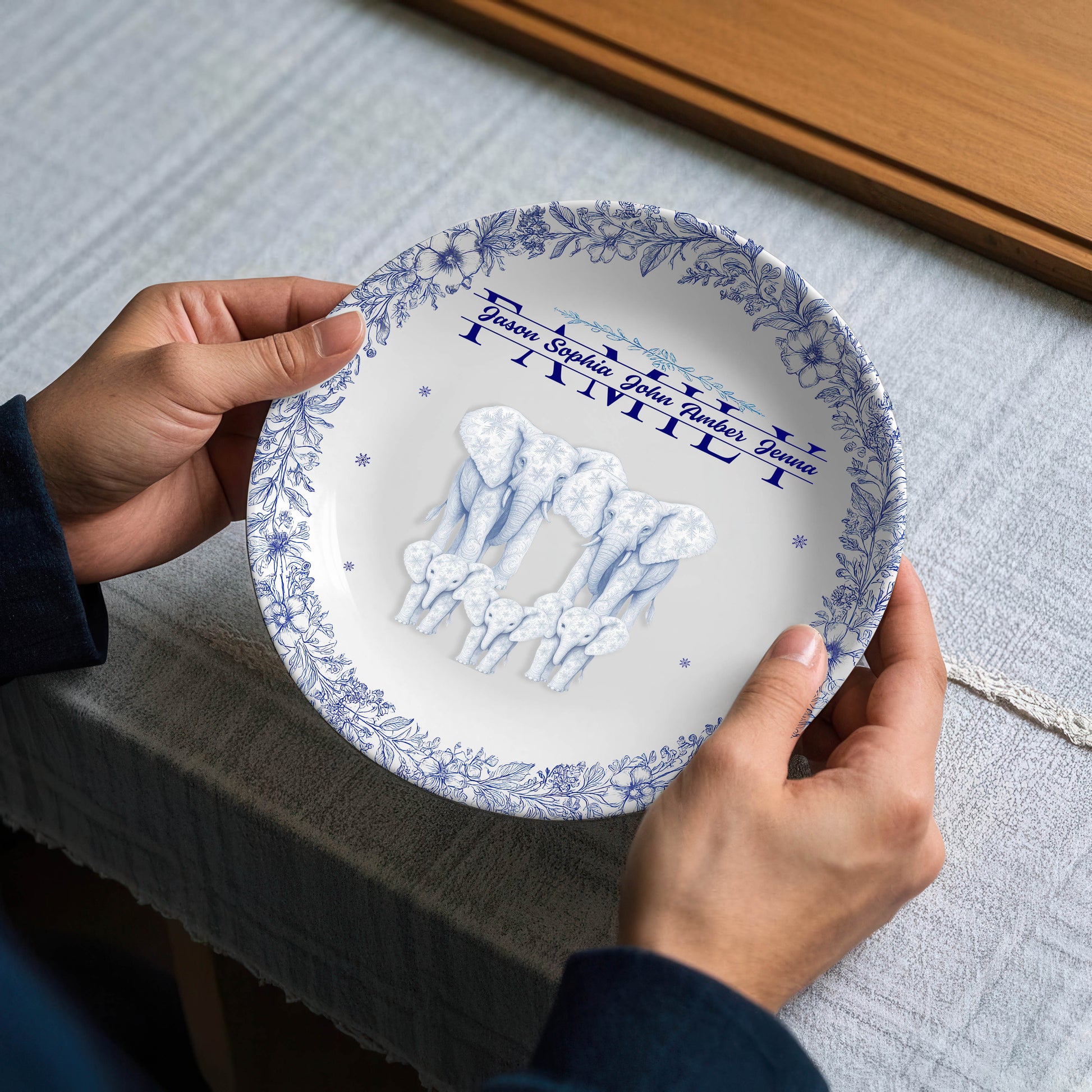 Custom Elephant Family Ceramic Plate with Stand – Personalized Gift for Home & Family Decor