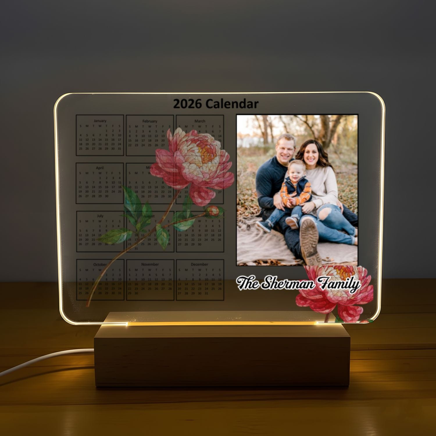 Custom Photo Acrylic Light Calendar 2026 -Personalized LED Desk Lamp with Family Name Monthly Flower Gift for Mom Dad Couple Family Home Decor
