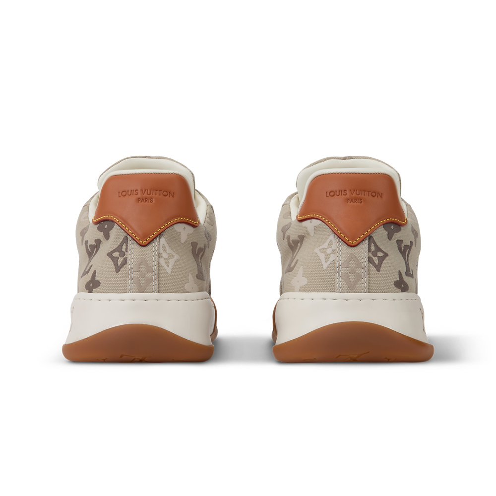 The LV Tilted sneaker is reimagined in Monogram Surplus canvas, a military-inspired pattern introduced by Men's Creative Director Pharrell Williams. This bold style, named for the tilted LV Initials signature on its outsole, nods to vintage 2000s' sneakers. The upper is complemented by trim in the House's emblematic natural leather.