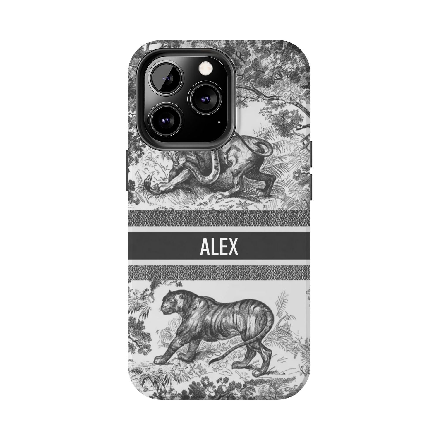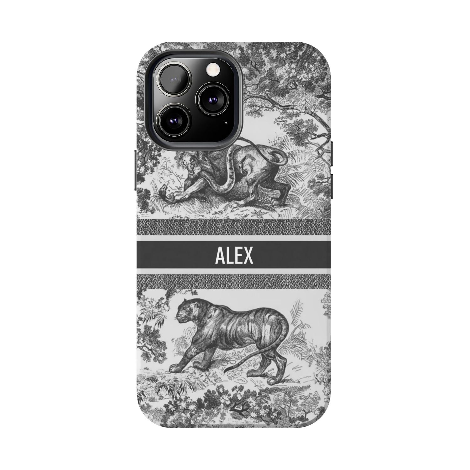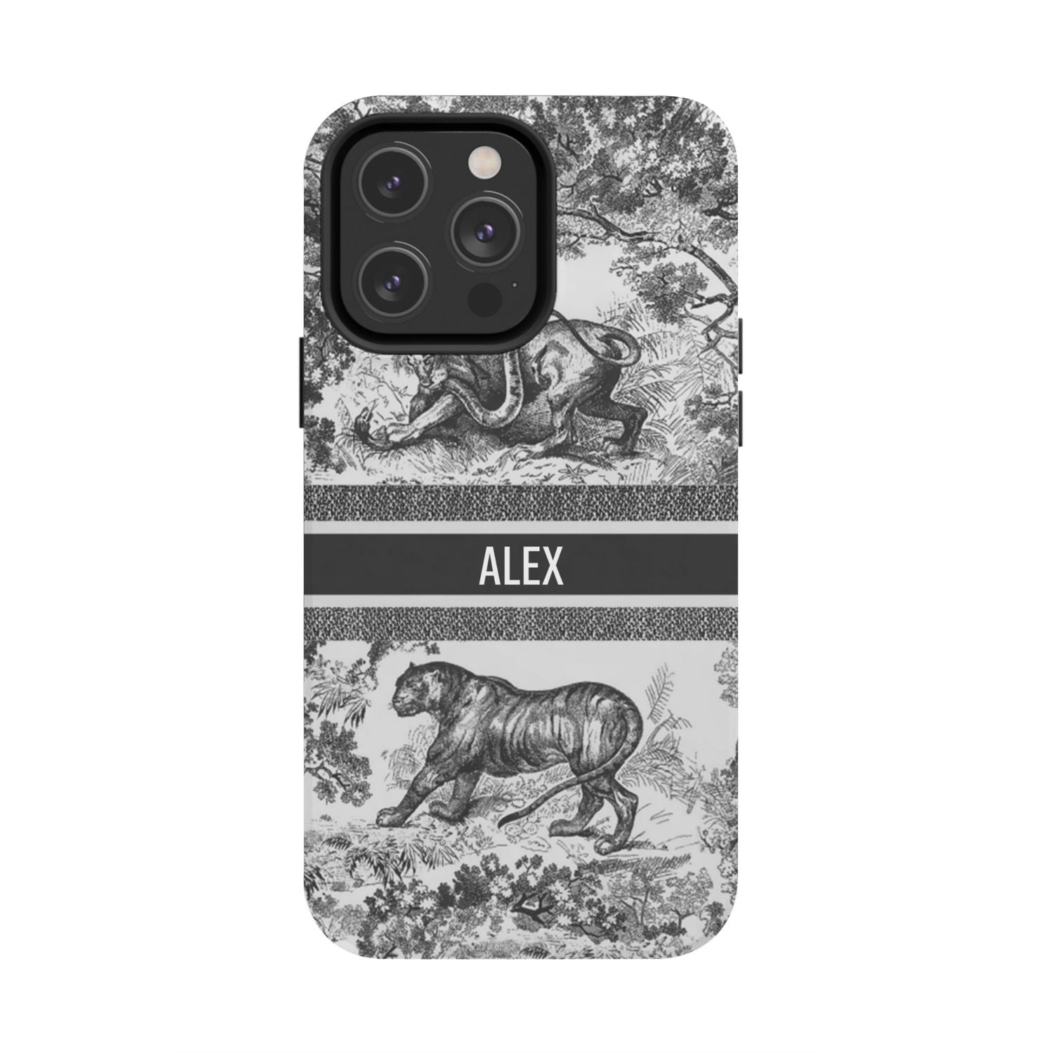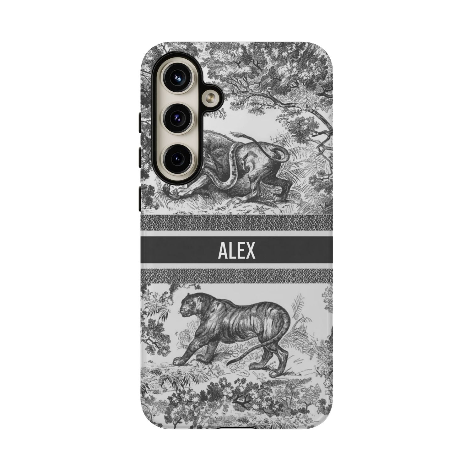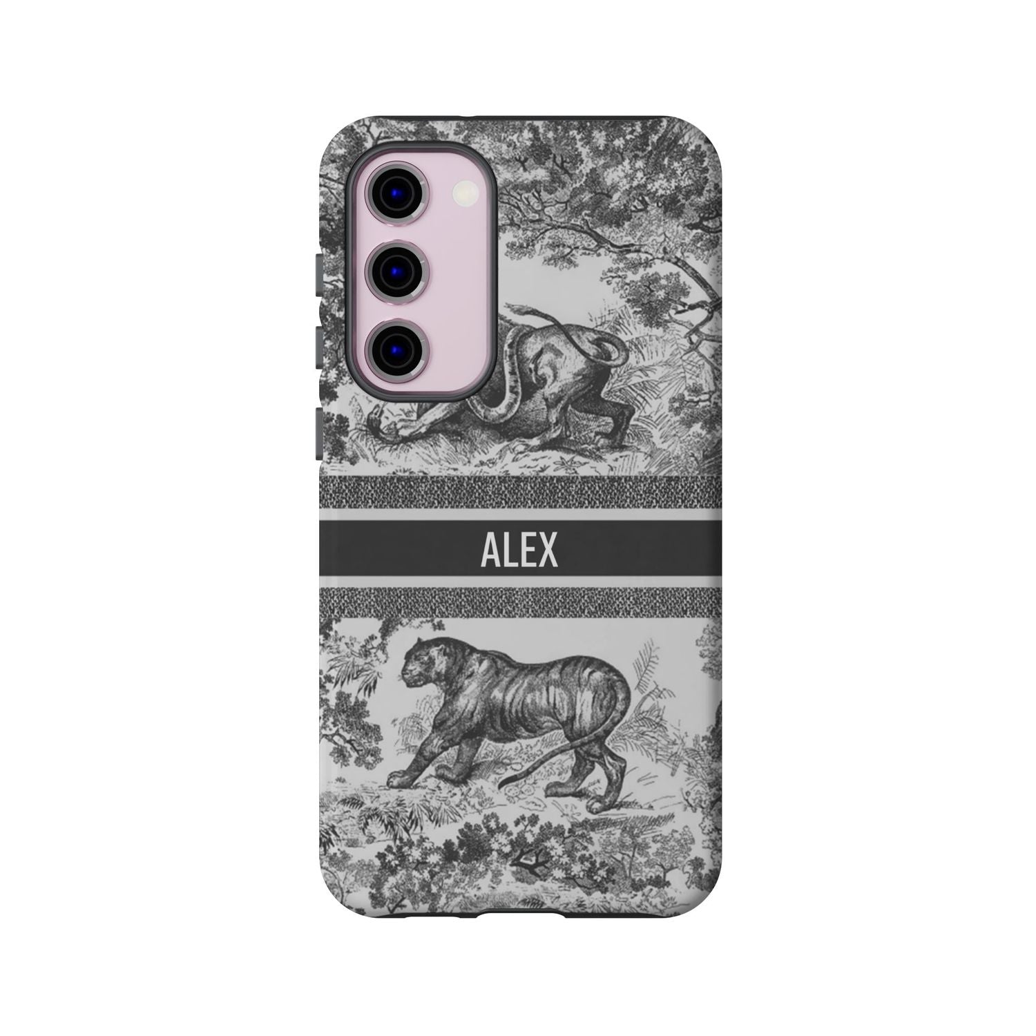 Custom Luxury Toile De Jouy Inspired Phone Case – Personalized Name Clear iPhone 12 13 14 15 16 Pro Max, Samsung 21 22 23 24 24.99 Plus/Ultra Cover
