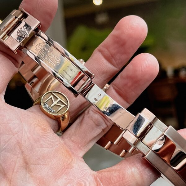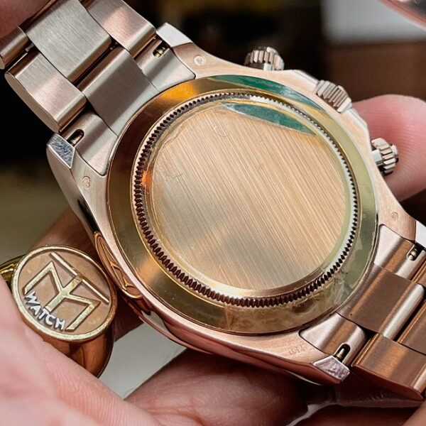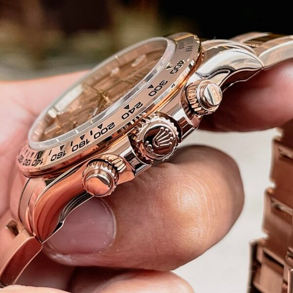 The Rolex Cosmograph Daytona 116505-0012 showcases its powerful allure with a case crafted entirely from Everose gold. The robust, solid case of the Daytona 116505 boasts an impressive 100m water resistance, and above all, the Everose gold material demonstrates superior properties unmatched by traditional gold. Durable and resistant to UV corrosion, Everose gold with its orange undertones is truly fashionable and captivating.